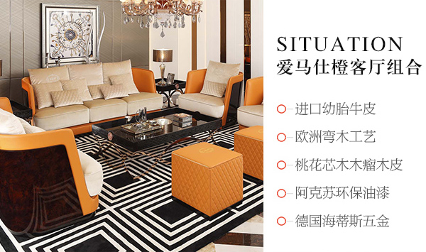 • 高端后現(xiàn)代輕奢客廳家具橙色皮桃木紋飾板真皮沙發(fā)組合